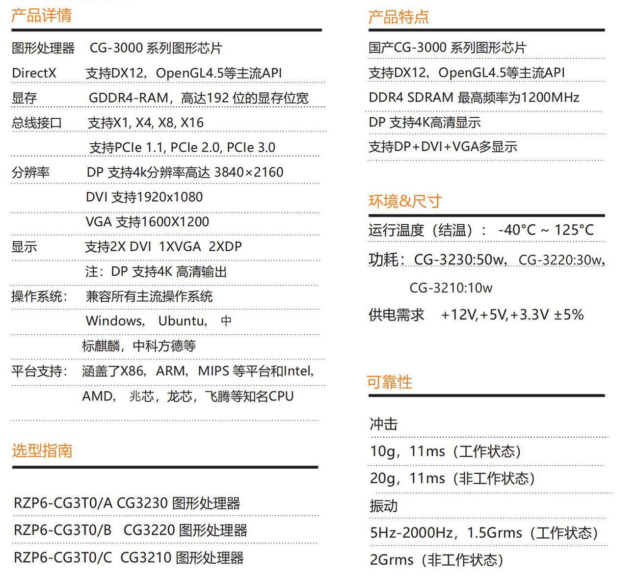 一款CPCI-E 6U 架構獨立顯卡,采用CG-3000 系列芯片 圖形芯片, 是國內領先的基于28 納米工藝的完全自主知識產權獨顯GPU 芯片,內置自主 研發的新一代強大的圖像處理引擎,為AI 應用做了特別優化,完全滿足各 種日常顯示需求。具有多顯示輸出擁有很高的軟件系統兼容性,兼容所有 主流操作系統,包括但不限于Windows, Ubuntu, 中標麒麟,中科 方德等。硬件系統的支持也涵蓋了X86,ARM,MIPS 等平臺和Intel, AMD,兆芯,龍芯,飛騰等知名CPU 生產商。獨有的超低功耗設計, 助力綠色辦公。所有的制程工藝和周邊器件全部可采用國內供應商, 確保完全自主可控,能夠應對最復雜的并行應用程序,比如地形繪