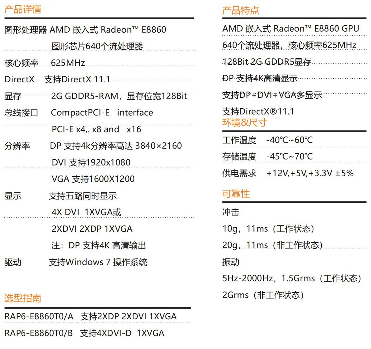 一 款 CPCI-E 6U 架 構 獨 立 顯 卡 , 采 用 AMD 嵌 入 式 Radeon E8860圖形芯片,具有 640個流處理器,核心頻率625MHz 128Bit 2G GDDR5顯存 支持DirectX?11。支持4K 高清顯示;具有出色多顯示輸出接口、(支持DP VGA 以及DVI接口輸出)該顯卡具有功耗可 以調節的特點,可在環境惡劣的環境工作。該產品有良好計算和圖形 性能,適合高性能的應用場合。在相同功率范圍內, GPU的性能是上 一代E6760的兩倍多,其單點精度浮點性能提高了33%,達到768 GFLOPS,這使得AMD E8860 GPU能夠應對最復雜的并行應用程 序,比如地形繪圖、雷達導航和氣象繪圖,面部和手勢識別,以及生 物識別分析等。