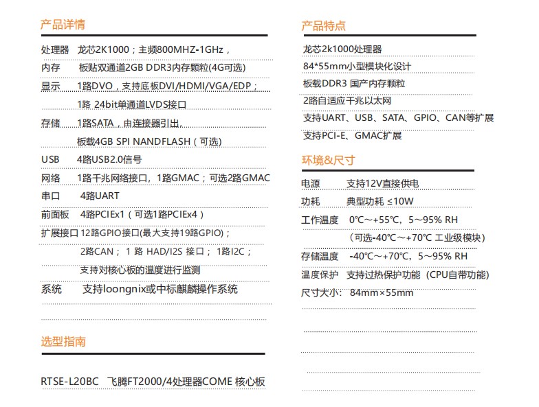 本產品基于國產化龍芯2K1000處理器研制的SOC單芯片解決方案,參考PICMG COM Express規范 以及COM Express Type10的 pin腳 定 義 , 尺 寸 為 Mini Module(84mm x55mm),標配板載DDR3 2GB內 存,最大支持4GB,模塊支持全國產化元器件。模塊支持豐富的I/O接口,模塊整體功耗小于10W。本產品 采用全表貼化設計,具有穩定、安全、可靠、實用性強等特點,可廣泛應用于國防、政府、科研、醫療、數 控、通訊、交通等領域。